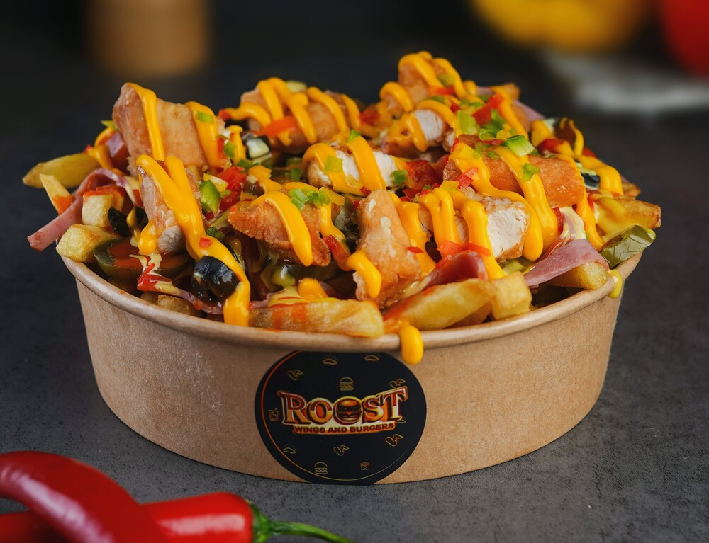 Boneless chicken, French fries, roast beef, black olives, sweet bell pepper, jalapeno, cheddar cheese, buffalo sauce, honey mustard sauce